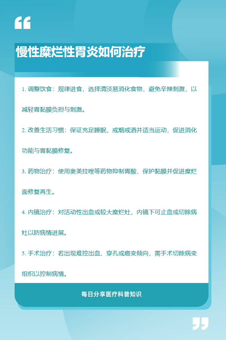 慢性糜烂性胃炎的治疗方法主要有调整饮食、改善生活习惯、药物治疗、内镜治疗、手术治疗等。