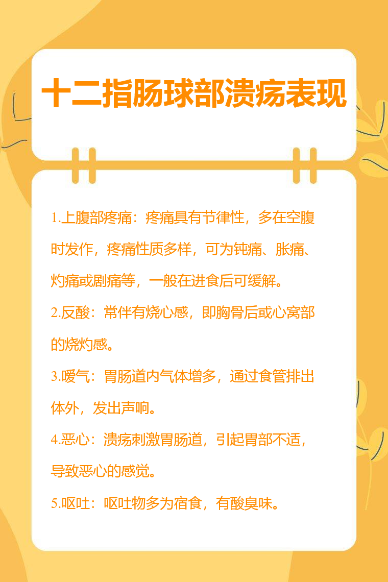 5.呕吐:当溃疡导致幽门梗阻等情况时,胃内容物无法正常排空,会出现呕吐症状,呕吐物多为宿食,有酸臭味。