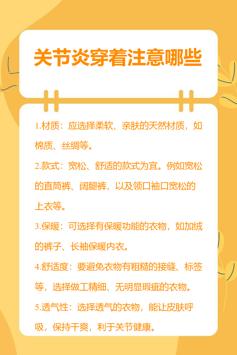 关节炎患者穿着需注意材质、款式、保暖、舒适度、透气性等。