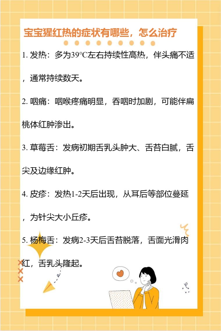 宝宝猩红热的症状有发热、咽痛、草莓舌、皮疹、杨梅舌等。