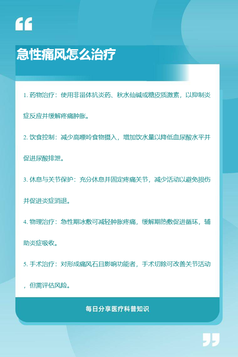 5. 手术治疗:当急性痛风形成痛风石,严重影响关节功能或导致皮肤破溃等情况时,需手术治疗。手术可切除痛风石,修复受损关节,改善关节功能,提高患者生活质量,但手术有一定风险,需严格评估后进行。