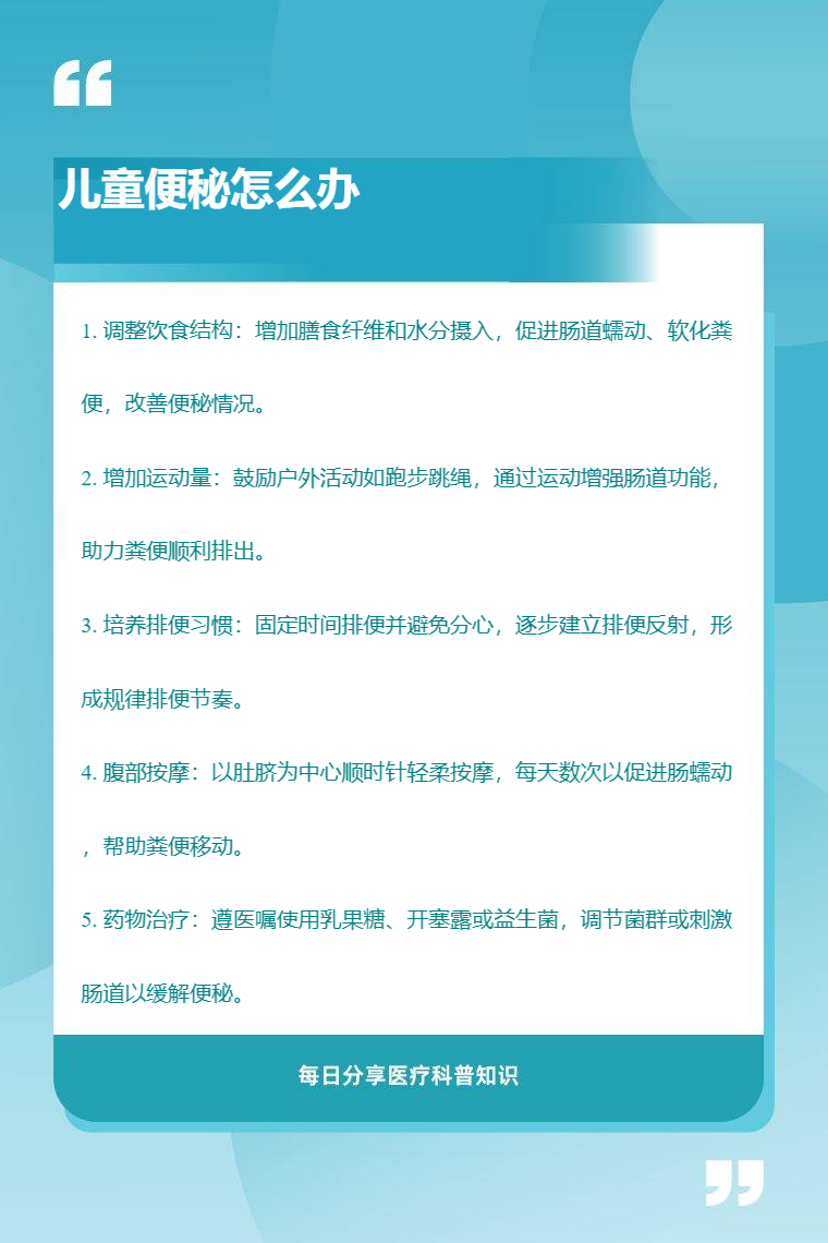 儿童便秘可通过调整饮食结构、增加运动量、培养排便习惯、腹部按摩、药物治疗等方法来应对。