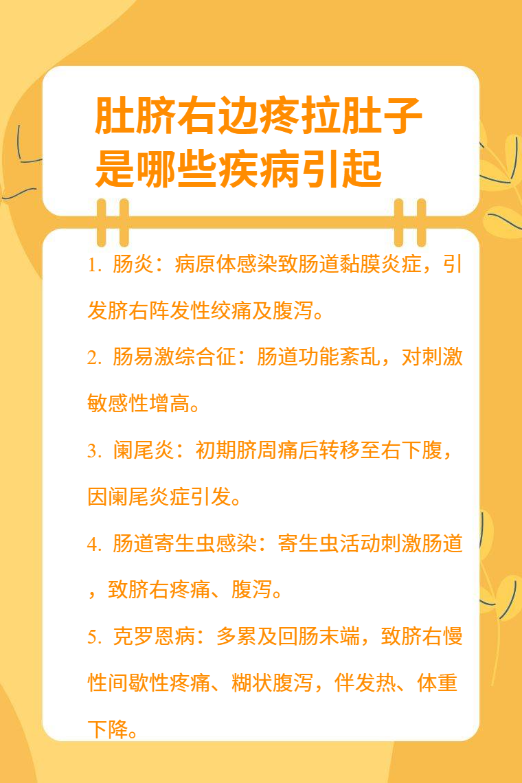 肚脐右边疼拉肚子可能由肠炎、肠易激综合征、阑尾炎、肠道寄生虫感染、克罗恩病等引起。