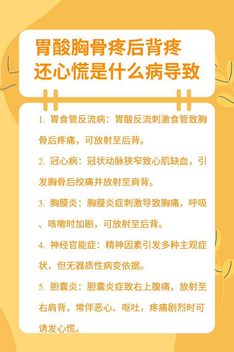 胃酸、胸骨疼、后背疼还心慌可能是胃食管反流病、冠心病、胸膜炎、神经官能症、胆囊炎等疾病导致。
