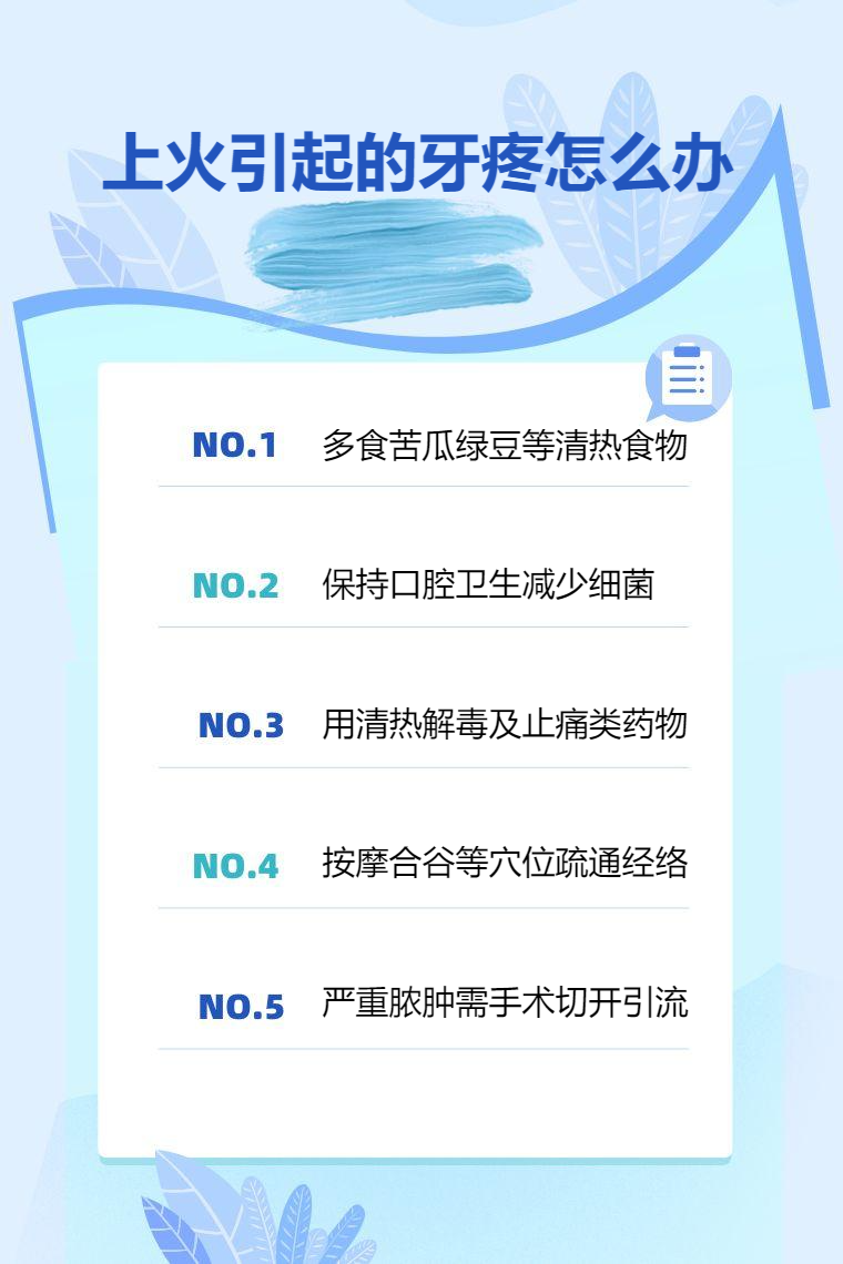 4. 中医理疗:中医理疗对上火牙疼也有一定效果。可通过按摩合谷穴、颊车穴等穴位。合谷穴位于手背,按摩此穴位能疏风解表、行气活血,减轻牙疼;颊车穴在面颊部,按摩它可起到通络止痛作用,刺激穴位调节身体气血运行,改善上火引起的牙疼情况。