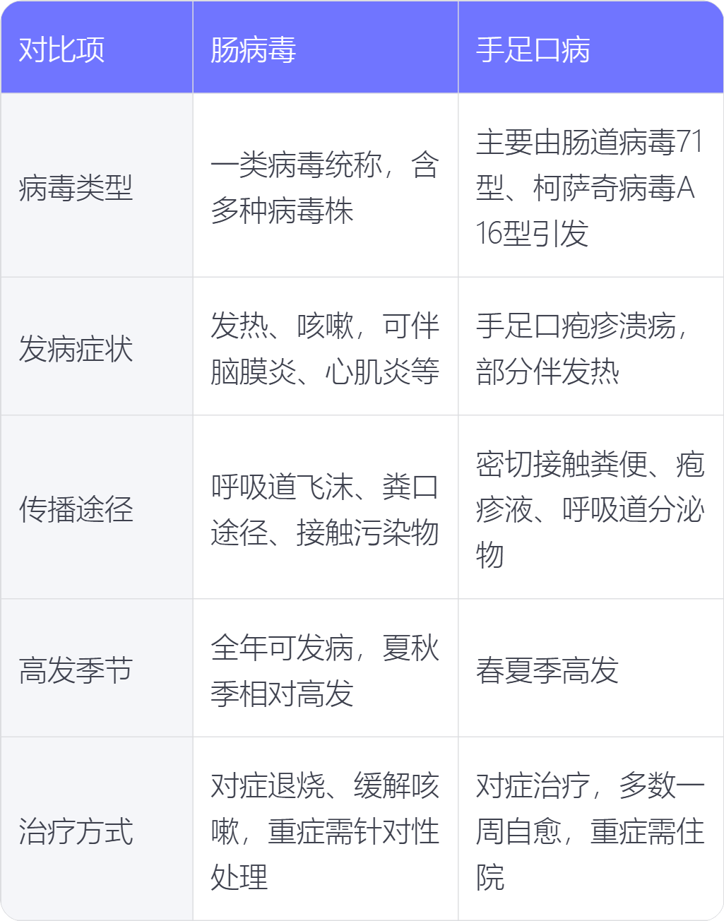 肠病毒和手足口病在病毒类型、发病症状、传播途径、高发季节、治疗方式上存在不同。
