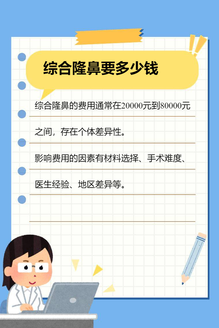 综合隆鼻的费用通常在 20000 元到 80000 元之间,存在个体差异性。影响费用的因素有材料选择、手术难度、医生经验、地区差异等。