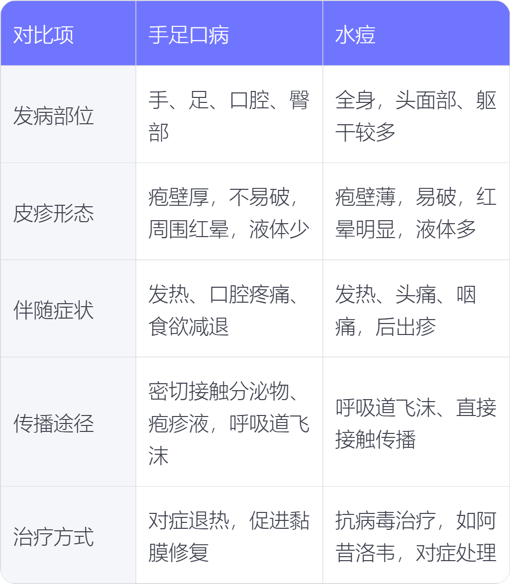 5. 治疗方式:手足口病主要是对症治疗,如发热时给予退热药物,口腔疼痛可使用促进黏膜修复的药物;水痘主要是抗病毒治疗,可使用阿昔洛韦等药物,同时对症处理发热等症状。