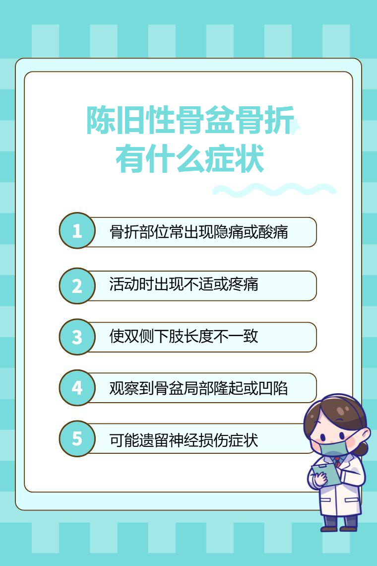 陈旧性骨盆骨折的症状包括疼痛、活动受限、肢体不等长、骨盆畸形、神经损伤等。