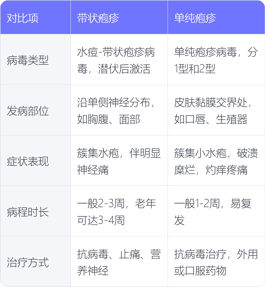 带状疱疹和单纯疱疹在病毒类型、发病部位、症状表现、病程时长、治疗方式上存在不同。