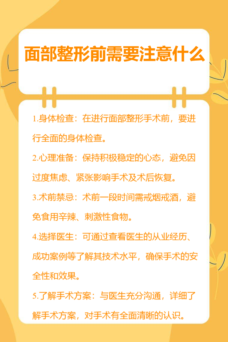 面部整形前需要注意身体检查、心理准备、术前禁忌、选择医生、了解手术方案等。