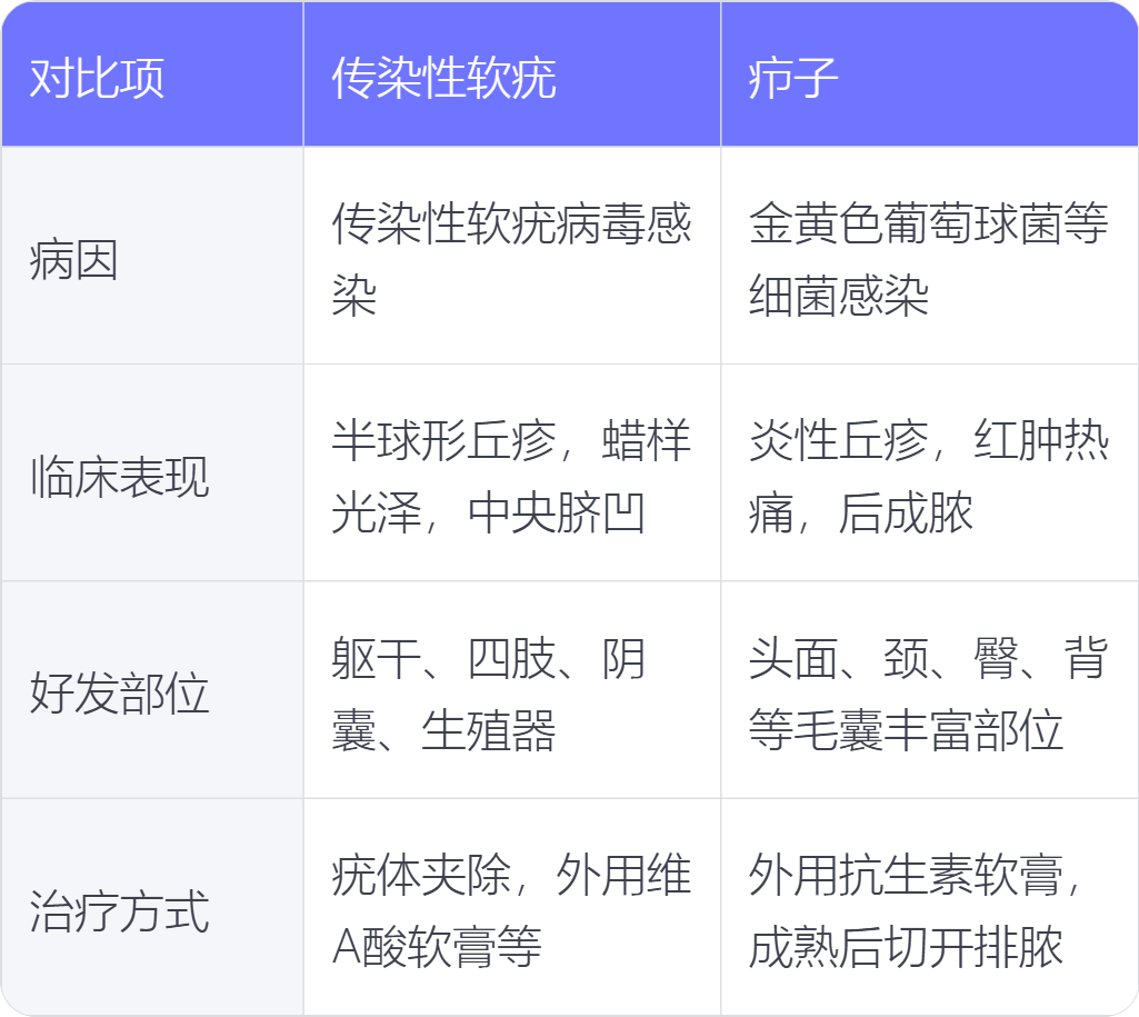 传染性软疣和疖子在病因、临床表现、好发部位、治疗方式上存在不同。