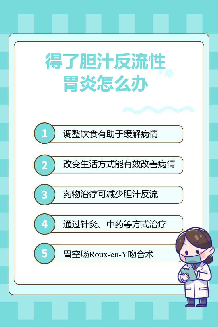 得了胆汁反流性胃炎可通过调整饮食、改变生活方式、药物治疗、中医调理、手术治疗等方法应对。