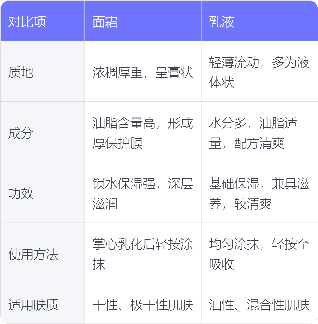 面霜和乳液在质地、成分、功效、使用方法、适用肤质方面存在不同。