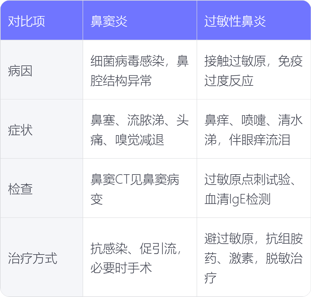 1.病因:鼻窦炎多由细菌、病毒感染引发鼻窦黏膜炎症,或因鼻腔结构异常阻碍鼻窦引流所致;过敏性鼻炎则是机体接触过敏原后,免疫系统过度反应引发的鼻黏膜非感染性炎症。
