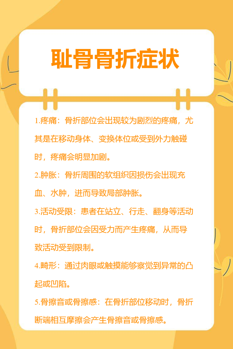 耻骨骨折症状有疼痛、肿胀、活动受限、畸形、骨擦音或骨擦感等。
