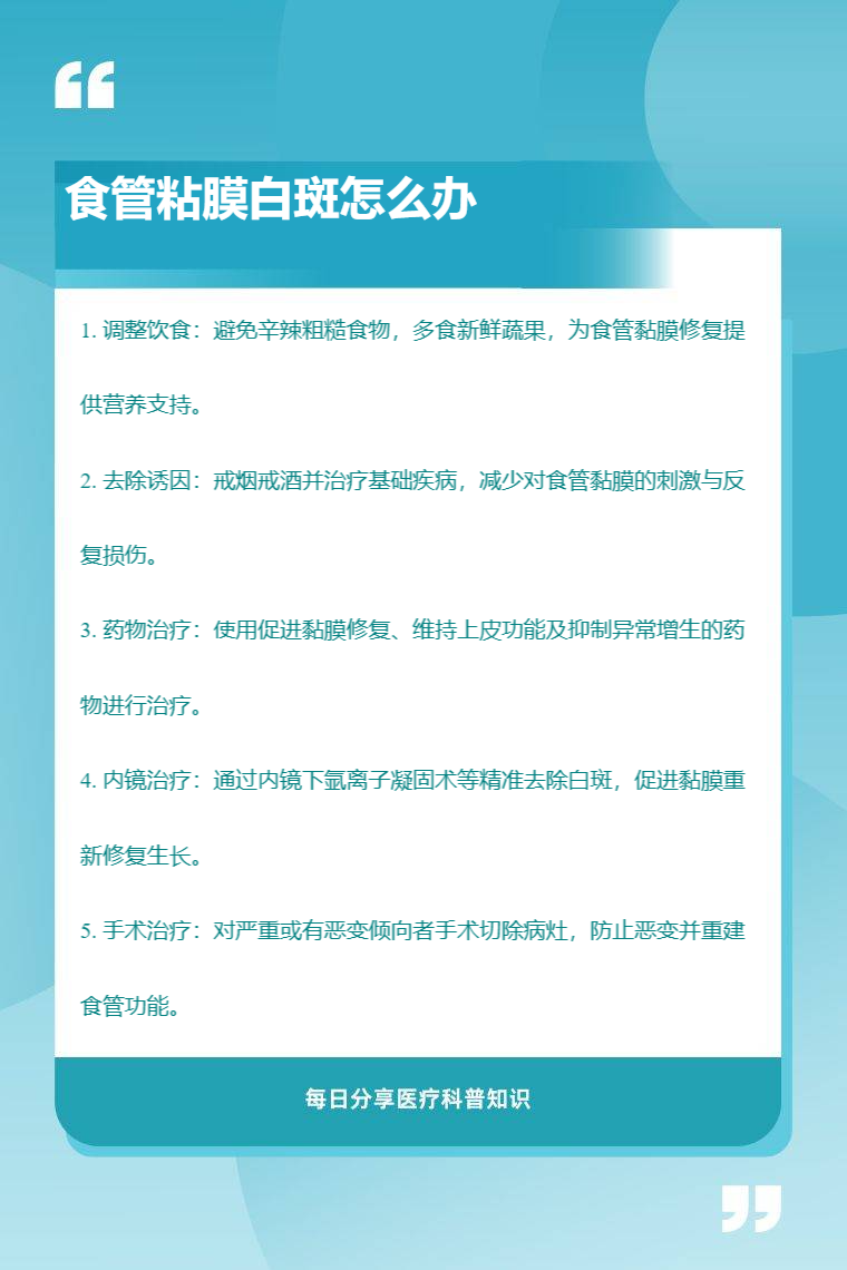 食管粘膜白斑可通过调整饮食、去除诱因、药物治疗、内镜治疗、手术治疗等方法处理。