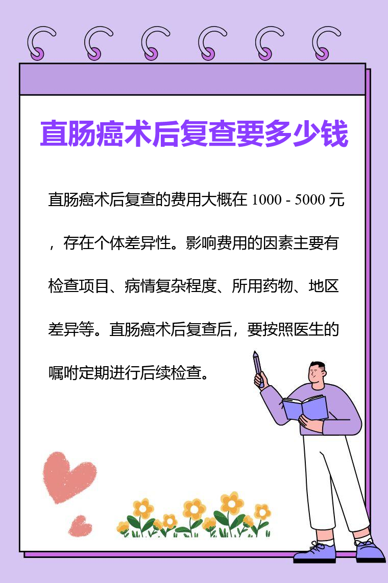 直肠癌术后复查的费用大概在 1000 - 5000 元,存在个体差异性。影响费用的因素主要有检查项目、病情复杂程度、所用药物、地区差异等。