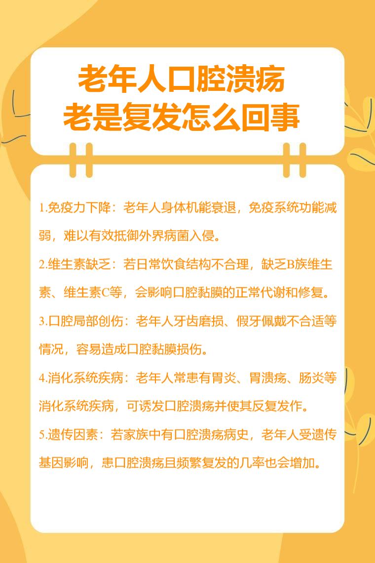 1.免疫力下降:老年人身体机能衰退,免疫系统功能减弱,难以有效抵御外界病菌入侵,口腔黏膜易受病原体侵袭引发炎症,进而导致口腔溃疡频繁发作。