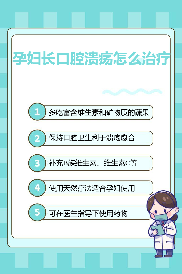 孕妇长口腔溃疡可通过调整饮食、保持口腔卫生、补充维生素、使用天然疗法、遵医嘱用药等方法治疗。