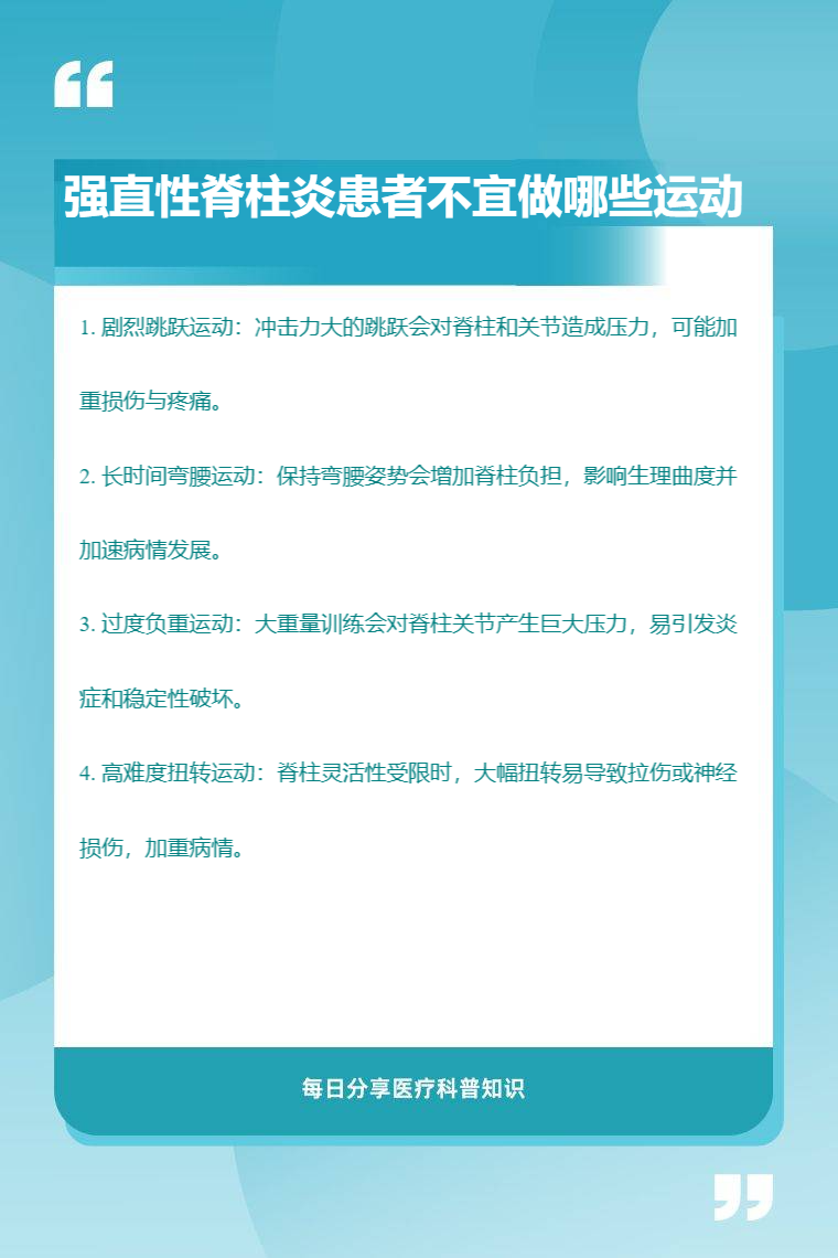 强直性脊柱炎患者不宜做剧烈跳跃运动、长时间弯腰运动、过度负重运动、高难度扭转运动等。