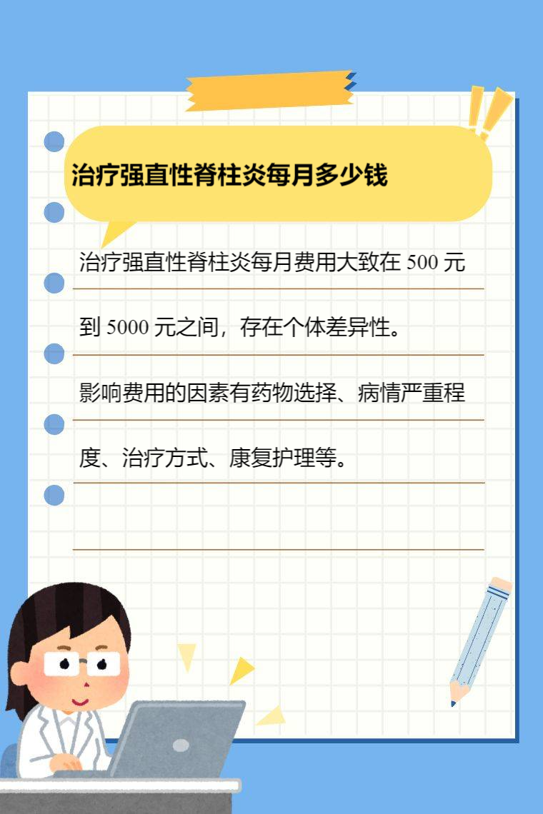 治疗强直性脊柱炎每月费用因多种因素而异,大致在 500 元到 5000 元之间,存在个体差异性。影响费用的因素有药物选择、病情严重程度、治疗方式、康复护理等。