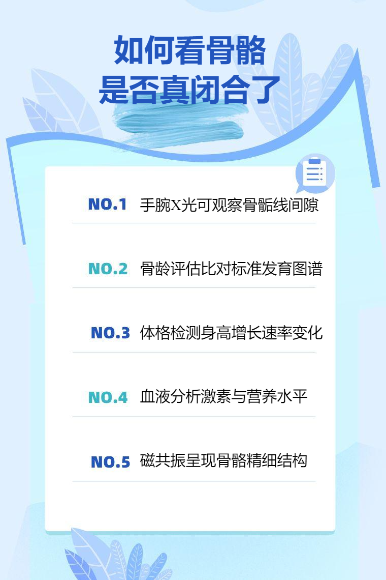 看骨骼是否真闭合可通过 X 光检查、骨龄评估、体格检查、血液检查、磁共振成像等。