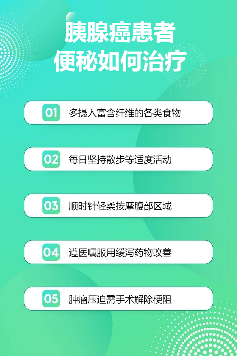 胰腺癌患者便秘可通过调整饮食结构、增加运动量、腹部按摩、使用缓泻药物、手术治疗等方法来缓解。