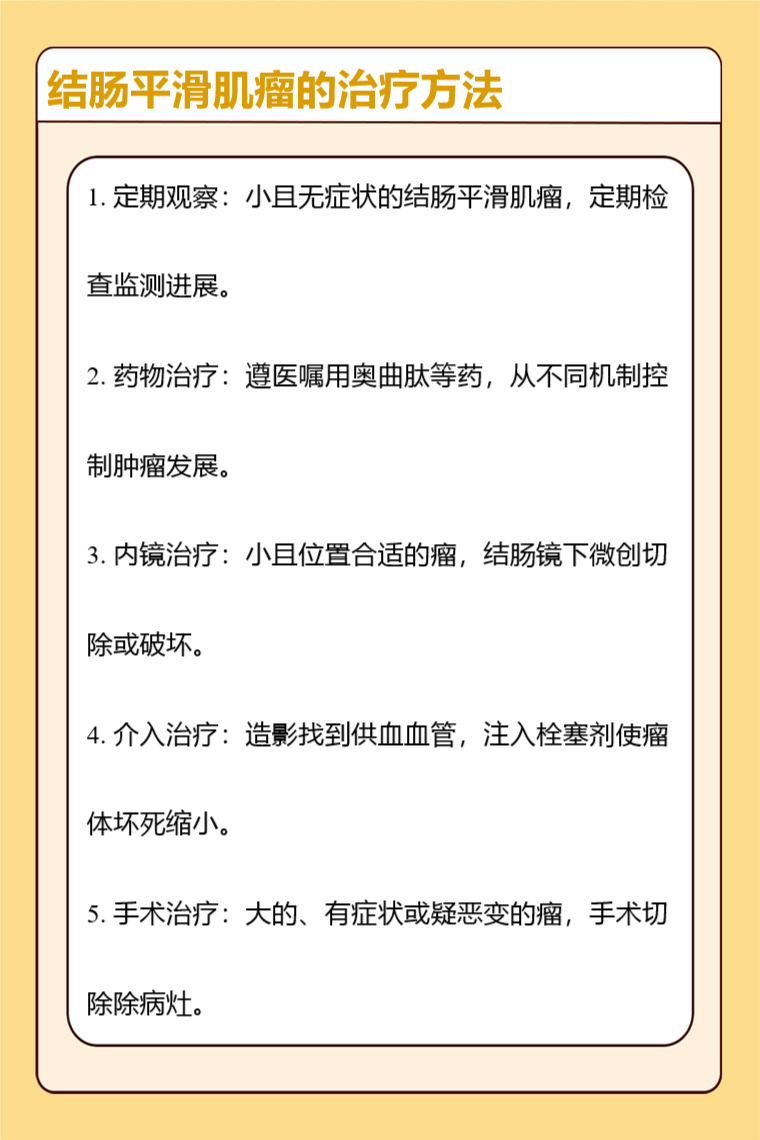 结肠平滑肌瘤的治疗方法主要有定期观察、药物治疗、内镜治疗、介入治疗、手术治疗等。