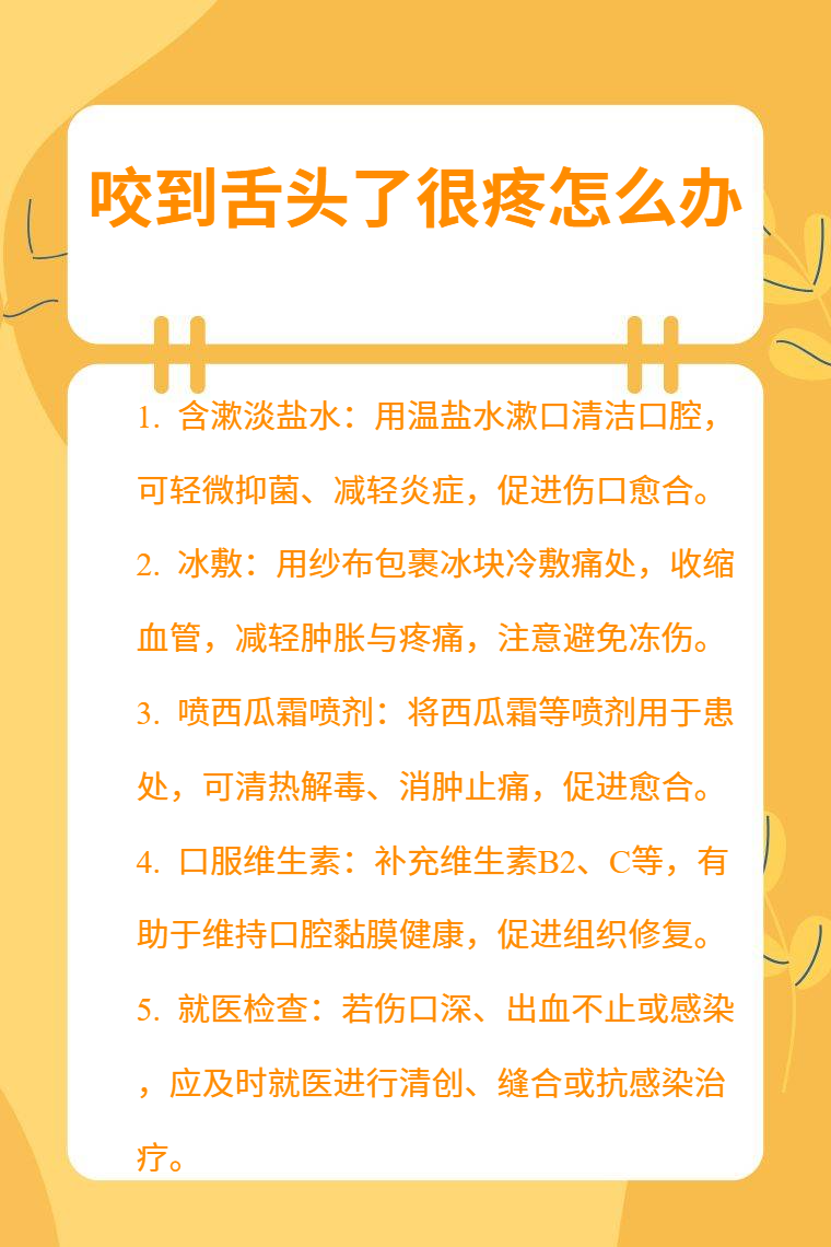 咬到舌头很疼可以通过含漱淡盐水、冰敷、喷西瓜霜喷剂、口服维生素、就医检查等方法来缓解疼痛等。
