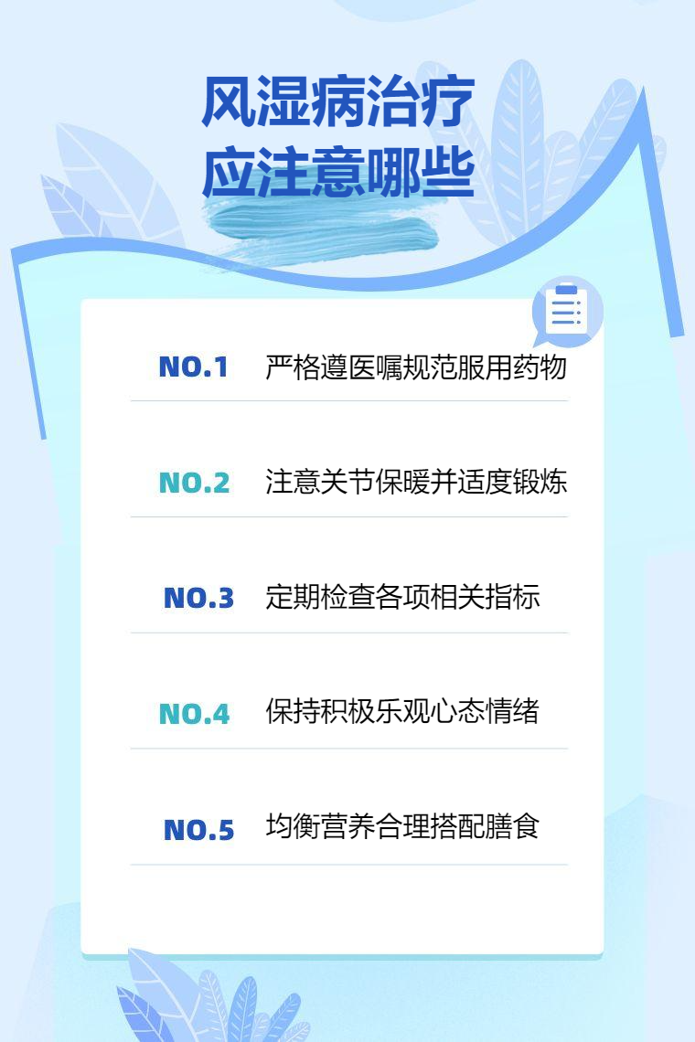 风湿病治疗应注意药物使用、日常护理、定期复查、心理调节、饮食搭配等。
