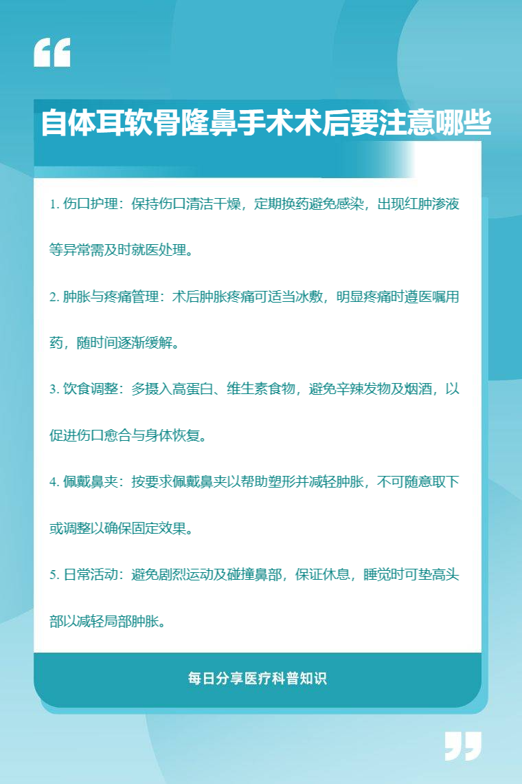 自体耳软骨隆鼻手术术后要注意伤口护理、肿胀与疼痛管理、饮食调整、佩戴鼻夹、日常活动等。