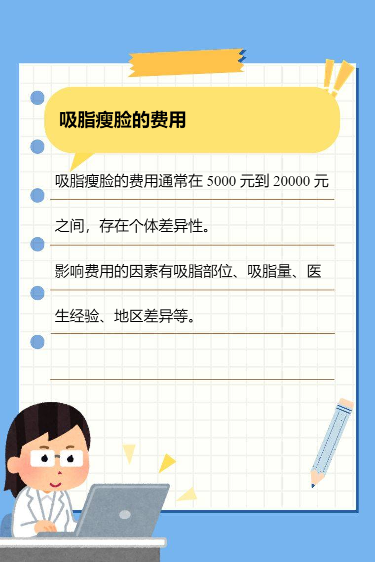 吸脂瘦脸的费用通常在 5000 元到 20000 元之间,存在个体差异性。影响费用的因素有吸脂部位、吸脂量、医生经验、地区差异等。