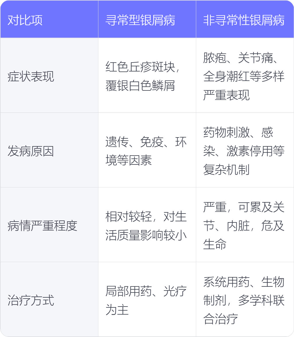 非寻常性银屑病与寻常型银屑病在症状表现、发病原因、病情严重程度、治疗方式上存在不同。