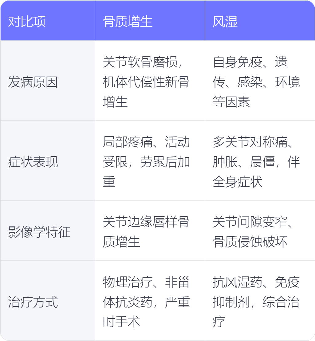 1. 发病原因:骨质增生主要是由于关节软骨磨损、破坏,机体为维持关节稳定而出现的代偿性新骨增生,多与年龄增长、关节过度使用、创伤等因素有关;风湿是一类侵犯关节、骨骼、肌肉、血管及有关软组织或结缔组织为主的疾病,病因多与自身免疫、遗传、感染、环境等因素相关。