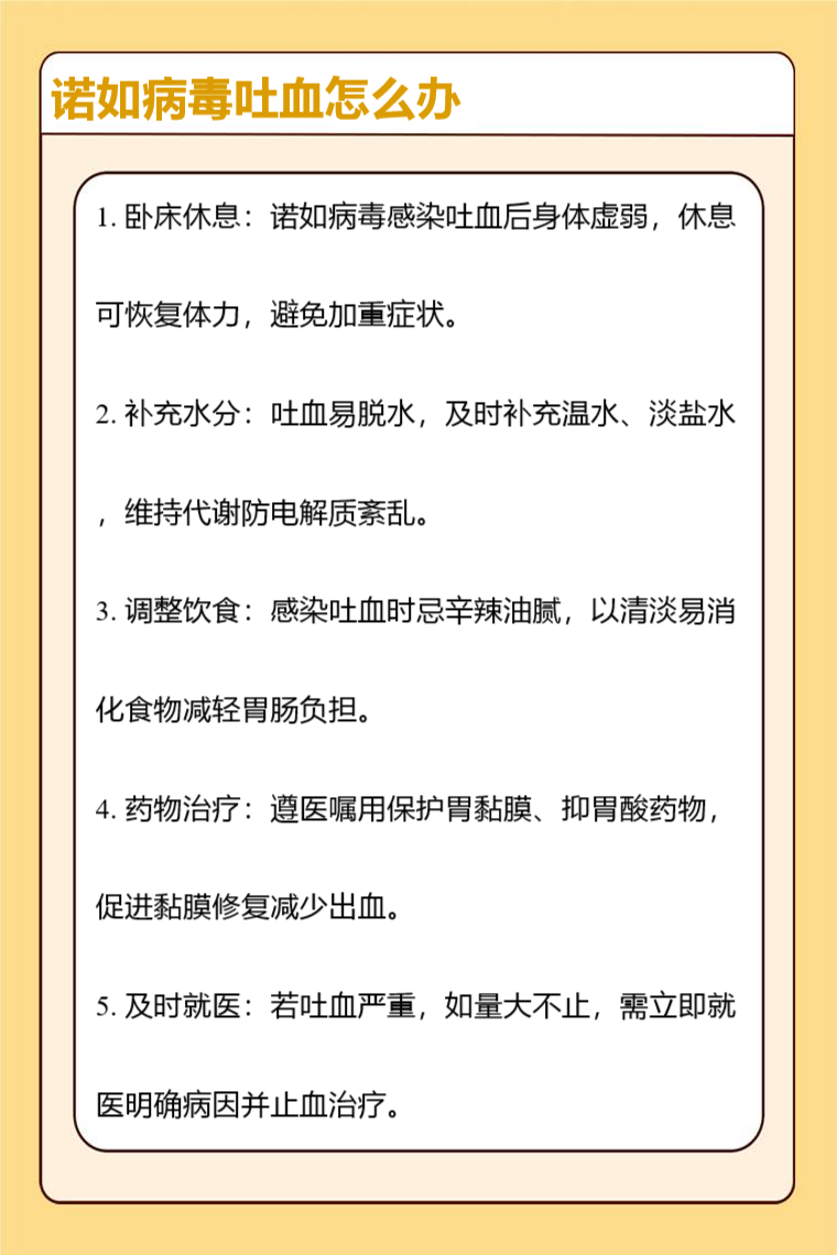 诺如病毒吐血可能由病情严重引发胃肠黏膜损伤、合并其他疾病等情况导致,以下从不同方面介绍应对方法:卧床休息、补充水分、调整饮食、药物治疗、及时就医等。