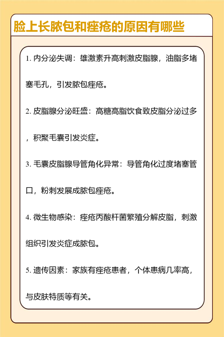 脸上长脓包和痤疮的原因有内分泌失调、皮脂腺分泌旺盛、毛囊皮脂腺导管角化异常、微生物感染、遗传因素等。