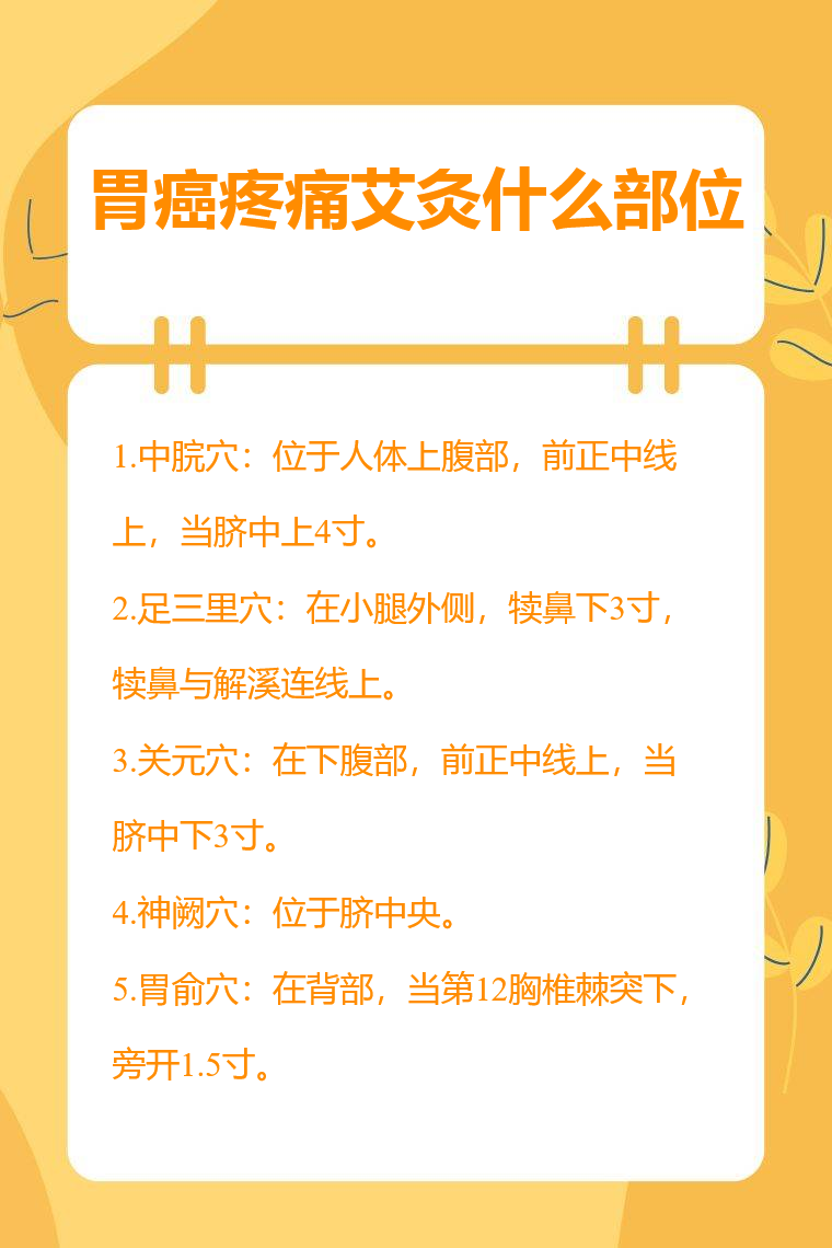 1.中脘穴:位于人体上腹部,前正中线上,当脐中上4寸。此穴为胃之募穴,六腑之会穴,艾灸中脘穴可和胃健脾、降逆利水,对胃癌引发的胃脘疼痛、腹胀、恶心、呕吐等有一定缓解作用,能调节胃肠功能,促进消化吸收,改善胃部不适症状。