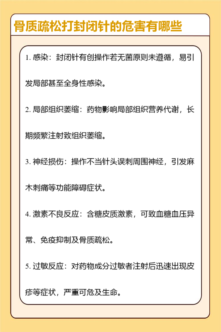 骨质疏松打封闭针的危害有感染、局部组织萎缩、神经损伤、激素不良反应、过敏反应等。