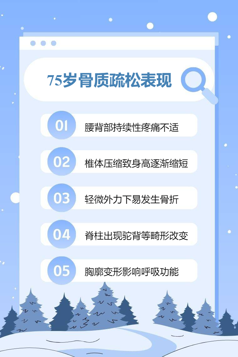 75 岁骨质疏松常表现为疼痛、身高变矮、骨折、脊柱变形、呼吸功能下降等。