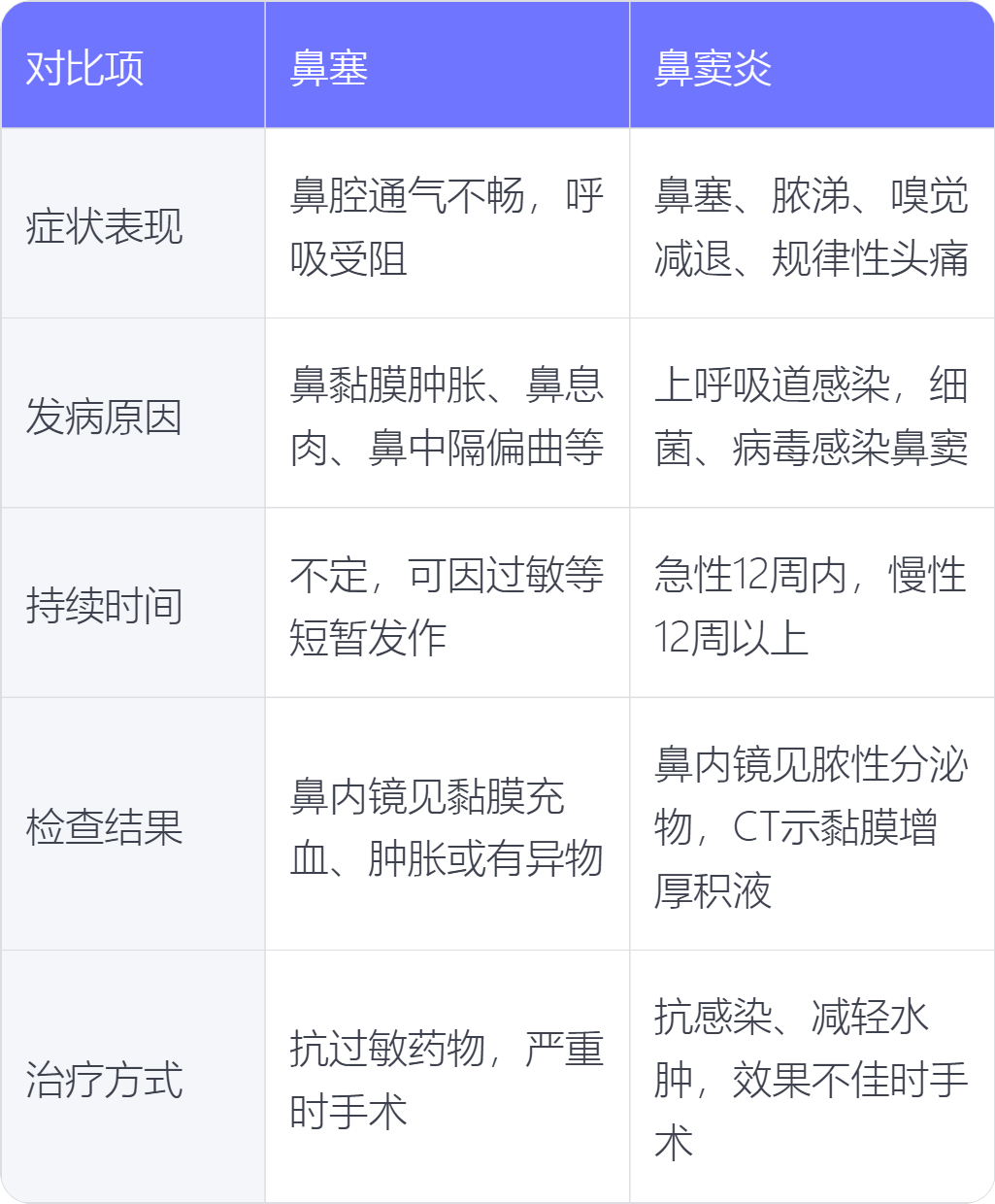 鼻塞和鼻窦炎可从症状表现、发病原因、持续时间、检查结果、治疗方式来分辨。