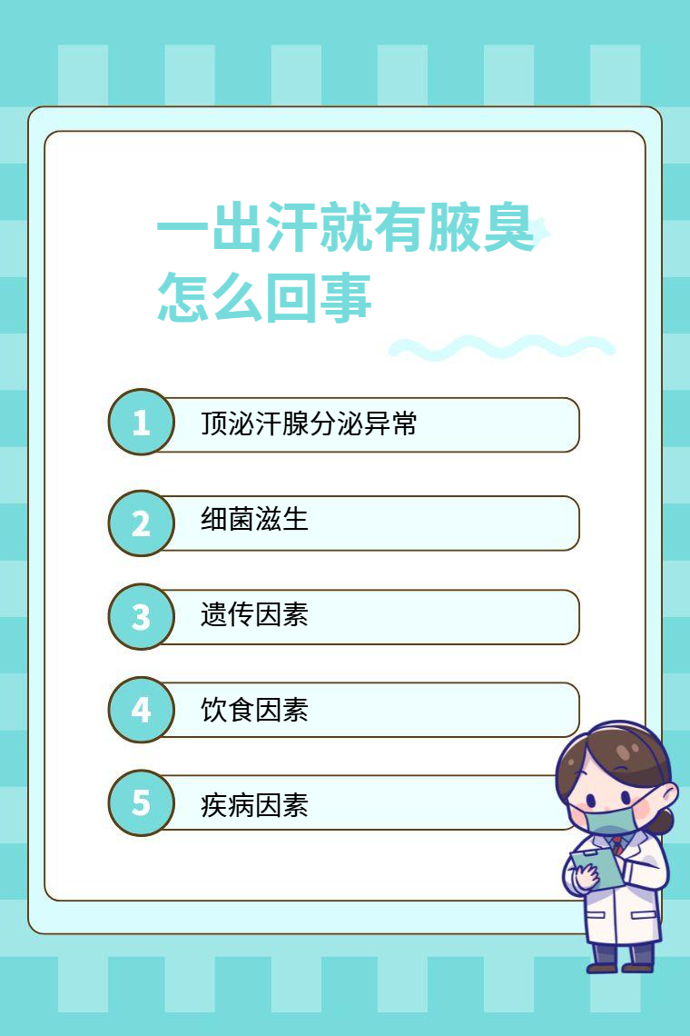 5. 疾病因素:某些疾病可能影响人体内分泌系统,导致汗腺分泌功能紊乱。如甲状腺功能亢进患者,甲状腺激素分泌过多,代谢加快,出汗增多,可能诱发或加重腋臭症状。