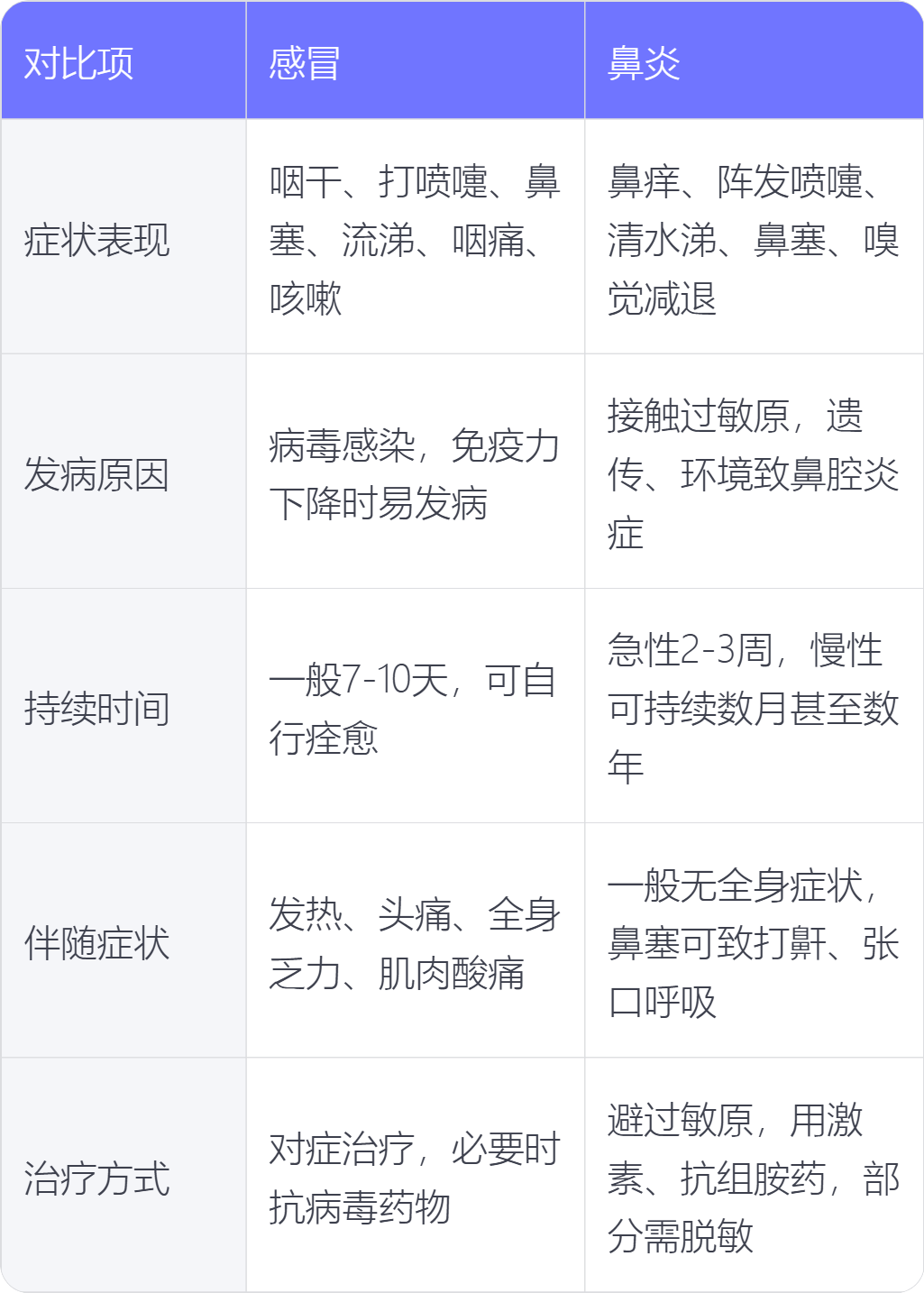 5. 治疗方式:感冒以对症治疗为主,如使用缓解鼻塞、流涕、止咳等药物,必要时使用抗病毒药物;鼻炎治疗需避免接触过敏原,使用鼻用糖皮质激素、抗组胺药物等控制症状,部分患者可能需脱敏治疗。