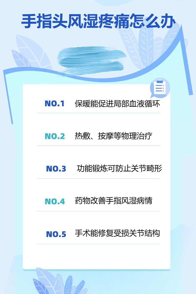 手指头风湿疼痛可通过保暖、物理治疗、功能锻炼、药物治疗、手术治疗等方法缓解。