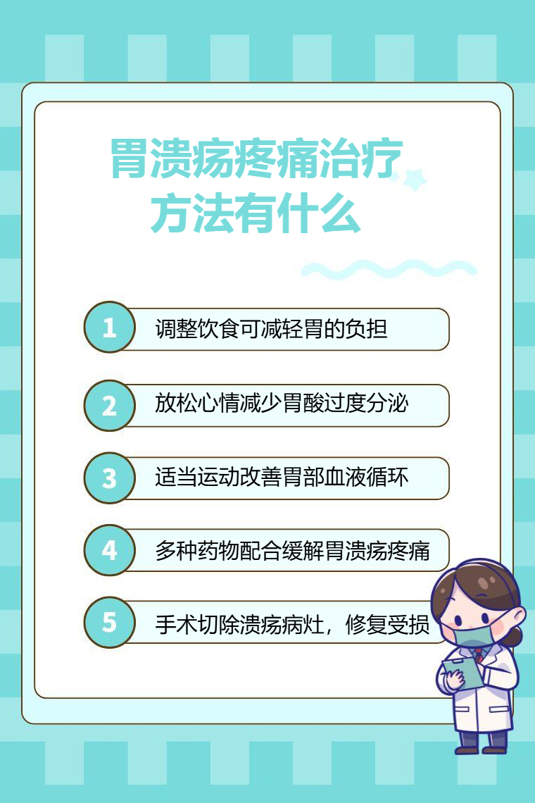 胃溃疡疼痛的治疗方法有调整饮食、放松心情、适当运动、药物治疗、手术治疗等。