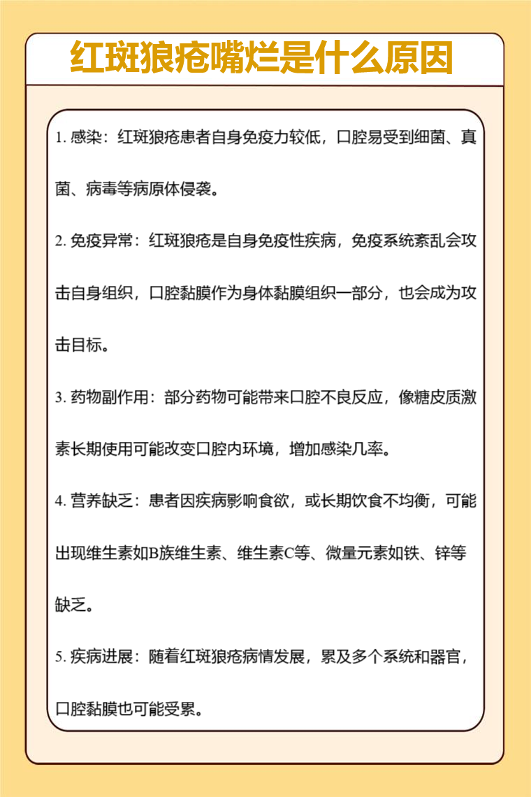 红斑狼疮嘴烂常见原因有感染、免疫异常、药物副作用、营养缺乏、疾病进展等。