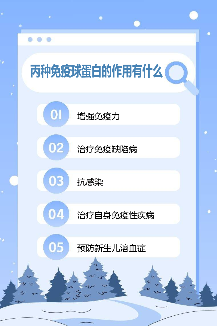 丙种免疫球蛋白具有增强免疫力、治疗免疫缺陷病、抗感染、治疗自身免疫性疾病、预防新生儿溶血症等作用。