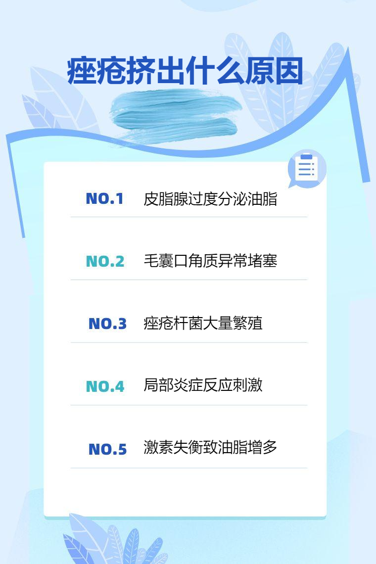 痤疮挤出的常见原因有皮脂腺分泌旺盛、毛囊口角化异常、痤疮丙酸杆菌繁殖、炎症反应、内分泌失调等。