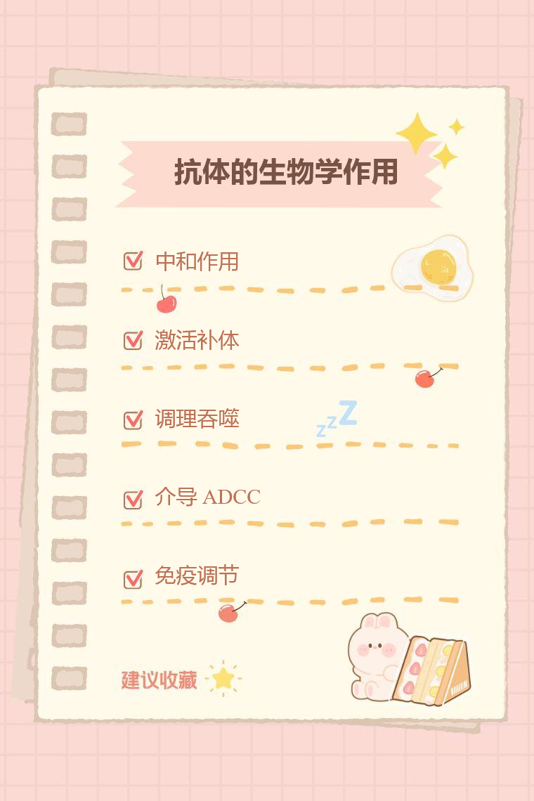 抗体具有中和作用、激活补体、调理吞噬、介导 ADCC、免疫调节等生物学作用。