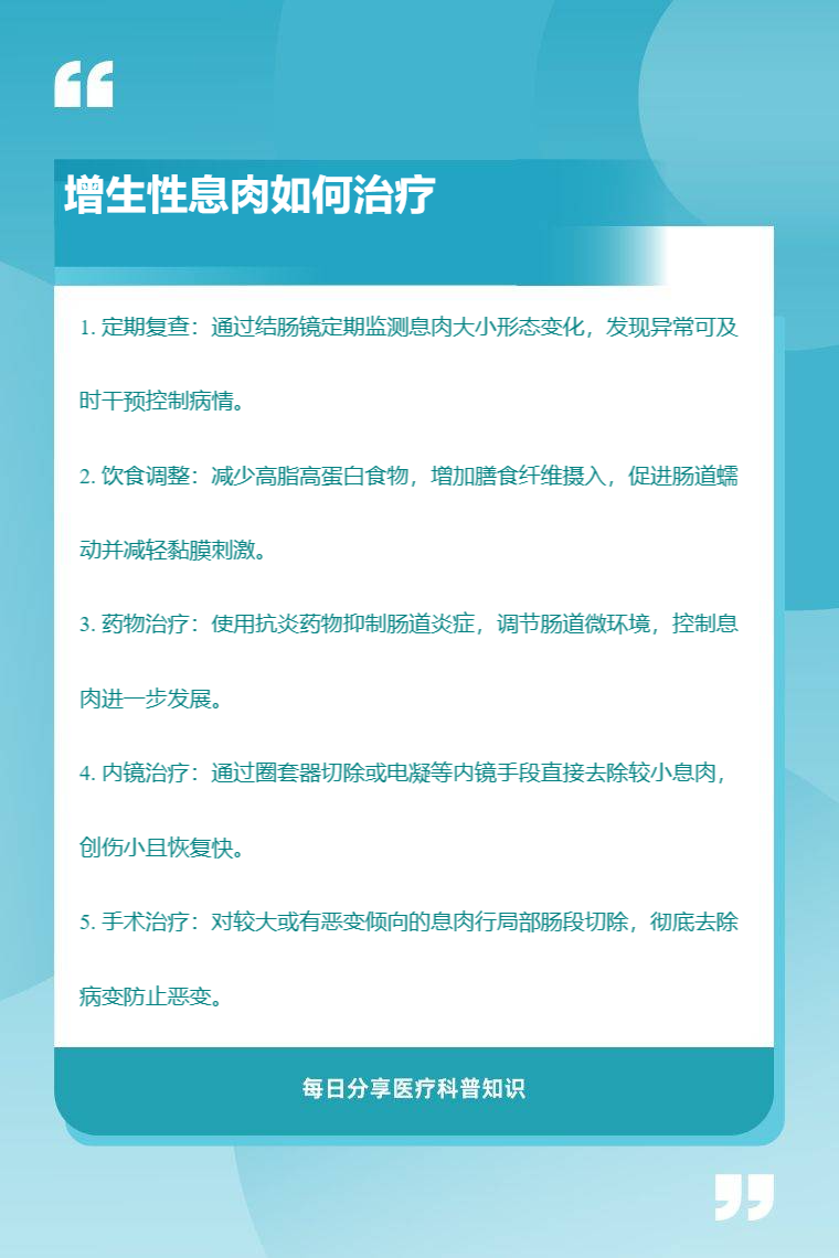 增生性息肉的治疗方法主要有定期复查、饮食调整、药物治疗、内镜治疗、手术治疗等。
